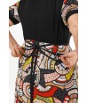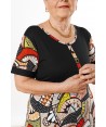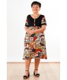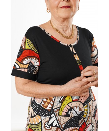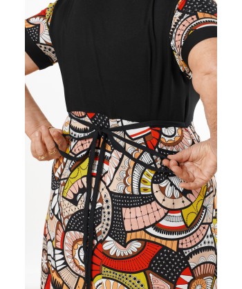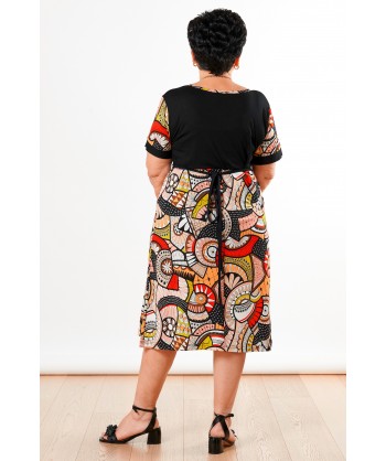 Abito maniche corte con corpetto tinta unita nero, bottoni e laccio in vita. Realizzato in viscosa con fantasia astratta in toni caldi.
