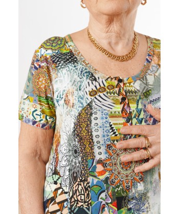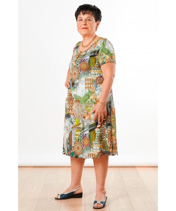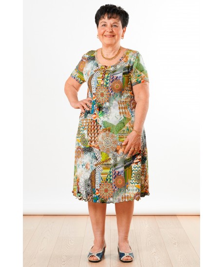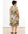 Abito maniche corte in taglie comode, scollo a giro con bottoni, realizzato in viscosa con stampa astratta tra fiori e geometrie nei toni del verde e dell'arancione