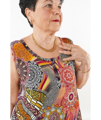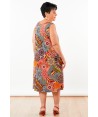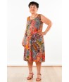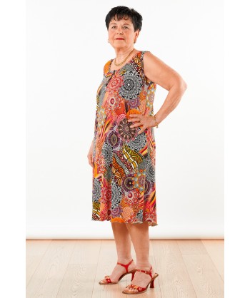 Abito spalla larga in taglie comode, scollo a giro con bottoni. Realizzato in viscosa con stampa vivace dai toni caldi tra geometrie e fiori.