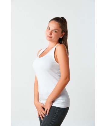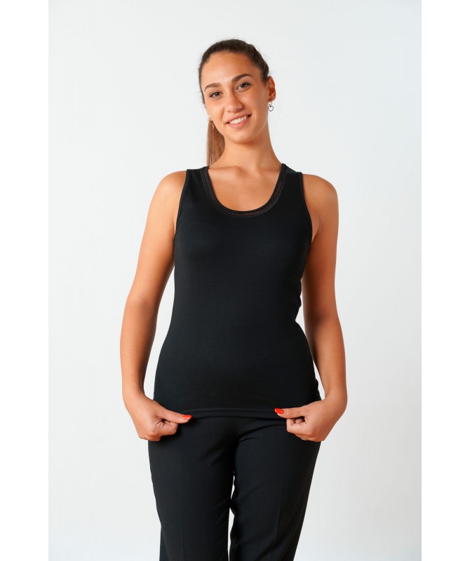 Canotta spalla larga in caldo cotone, scollo tondo bordato con greca.