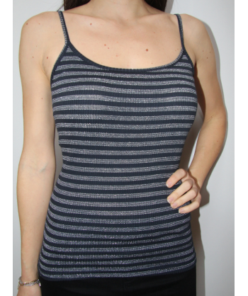 Canotta spalline sottili, realizzata in cotone a costine con fibra metallizzata. Fantasia a righe.