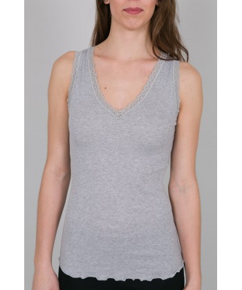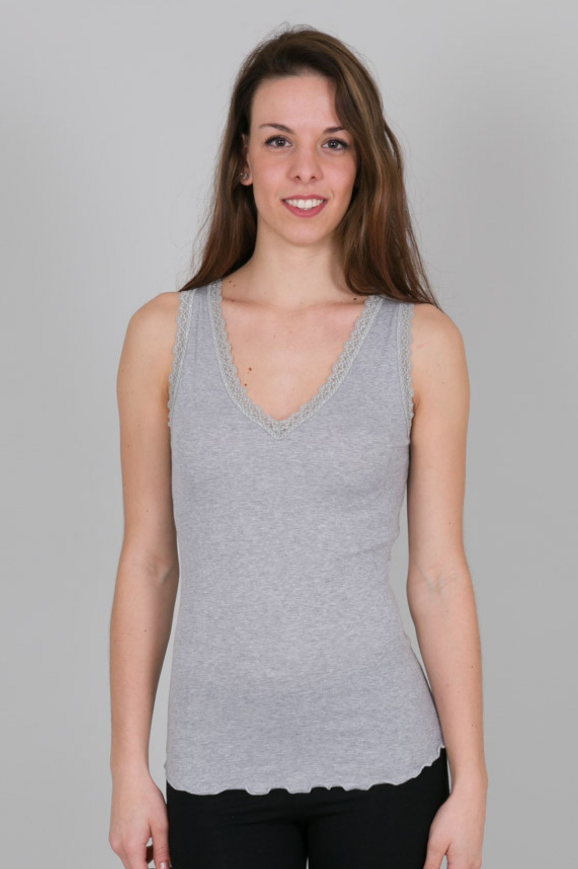 Canotta spalla larga in puro cotone, scollo a V e girobraccio bordati con pizzo. Sul fondo, l'elegante orlo a bambola, una particolare cucitura arricciata, rende questo capo utilizzabile anche come sottogiacca.
