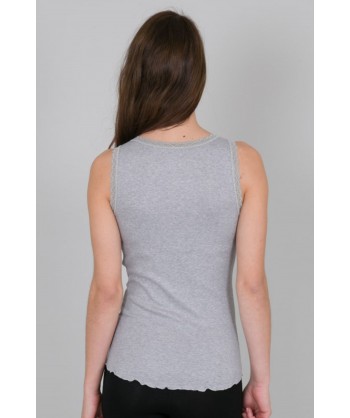 Canotta in puro cotone con spalline sottili, scollo dritto bordato in pizzo. Sul fondo, l'elegante orlo a bambola, una particolare cucitura arricciata, rende questo capo utilizzabile anche come sottogiacca.