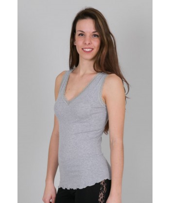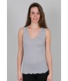 Canotta in puro cotone con spalline sottili e scollo a V bordati in pizzo. Sul fondo, l'elegante orlo a bambola, una particolare cucitura arricciata, rende questo capo utilizzabile anche come sottogiacca.