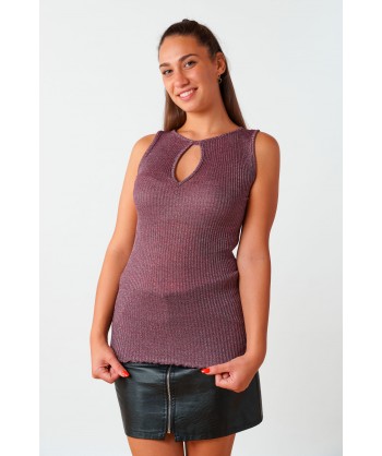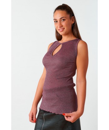Canotta realizzata in microlana plissettata a costine e fibra metallizzata color argento, spalla larga e scollo a giro con cut out a mandorla centrale. Il fondo è rifiniti con una particolare cucitura arricciata detta orlo a bambola, così da rendere questa canotta ancora più elegante e rifinita.