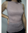 Canotta realizzata in microlana plissettata a costine e fibra metallizzata color argento, spalla larga e scollo a barchetta. Il fondo è stato decorato con una cucitura arricciata detta orlo a bambola, così da rendere questa canotta ancora più elegante e rifinita.