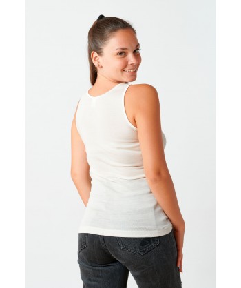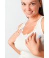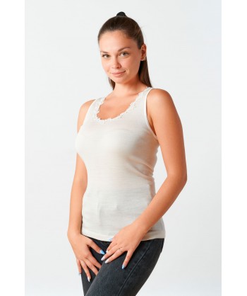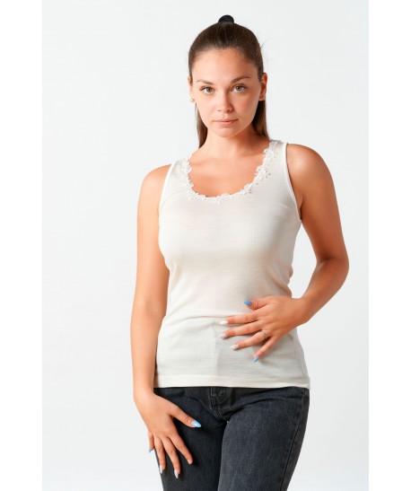 Canotta spalla larga in microlana. Lo scollo tondo è rifinito con una lista in macramè dall'elegante ricamo floreale.