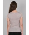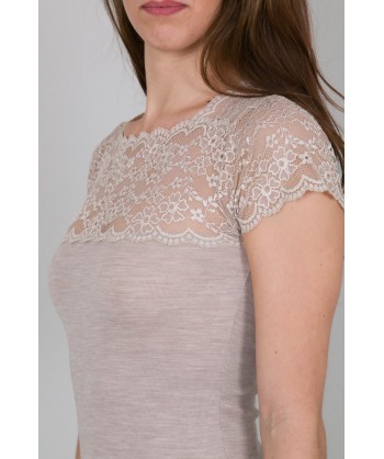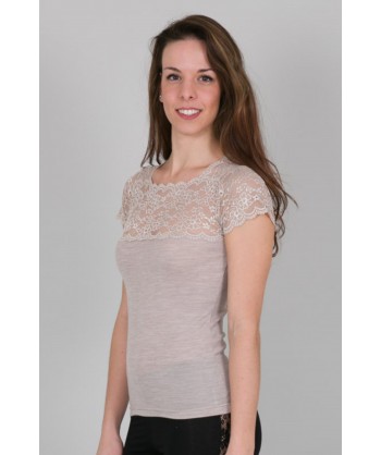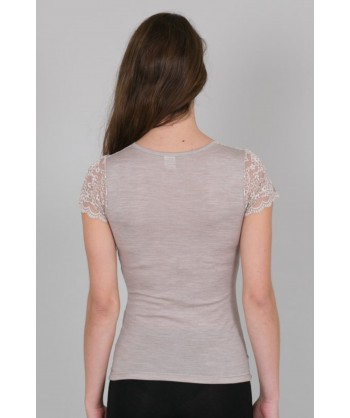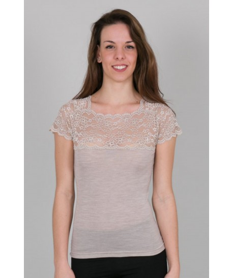 Maglia in microlana con maniche corte e scollo quadrato. Il pizzo che abbiamo applicato su decolleté e spalle la rende perfetta come sottogiacca, si tratta di una balza di alta qualità con un elegante ricamo floreale.