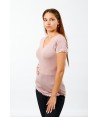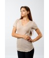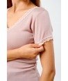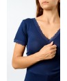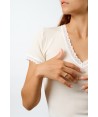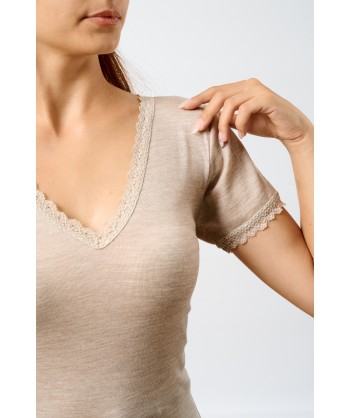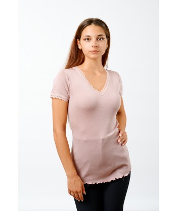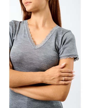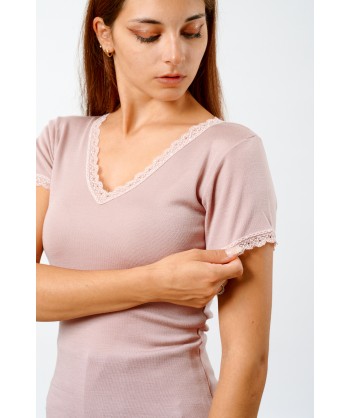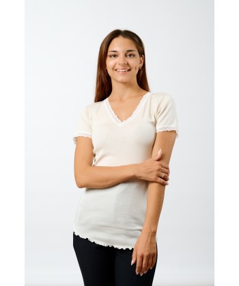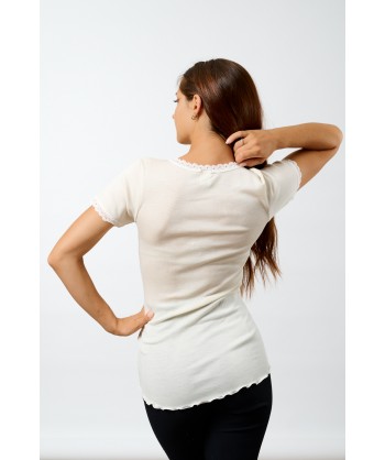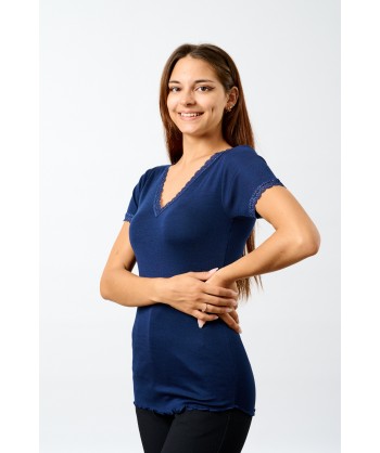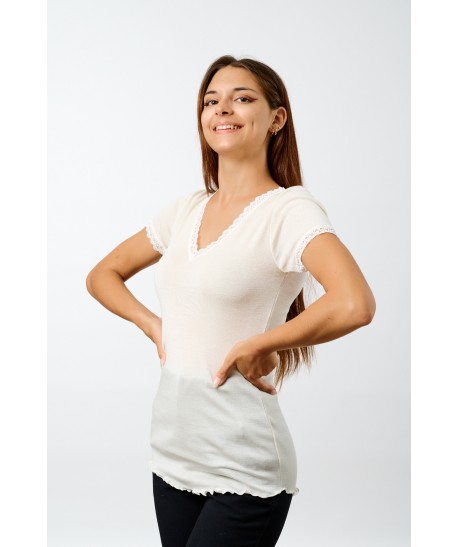 Maglia in microlana, con maniche corte. Abbiamo rifinito lo scollo a V e le maniche con una lista in pizzo dal ricamo floreale di alta qualità. Il fondo è rifinito con una particolare cucitura arricciata detta orlo a bambola, studiata per completare questa maglia così raffinata e romantica. Usala come maglia intima o sottogiacca, darà grande risalto al tuo look.