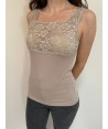 Canotta in modal con spalline sottili. L'unicità di questa canotta è la balza in pizzo che abbiamo inserito sul decolleté in trasparenza. Si tratta di un pizzo di alta qualità, morbidissimo ed elasticizzato, molto raffinato nella sua lavorazione floreale, lucente e in rilievo.
