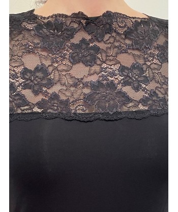Maglia in modal con maniche corte. L'unicità di questa canotta è la balza in pizzo che abbiamo inserito in trasparenza sul decolleté e per realizzare le maniche. Si tratta di un pizzo di alta qualità, morbidissimo ed elasticizzato, molto raffinato nella sua lavorazione floreale lucente e in rilievo.