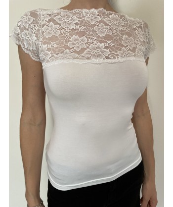 Maglia in modal con maniche corte. L'unicità di questa canotta è la balza in pizzo che abbiamo inserito in trasparenza sul decolleté e per realizzare le maniche. Si tratta di un pizzo di alta qualità, morbidissimo ed elasticizzato, molto raffinato nella sua lavorazione floreale lucente e in rilievo.