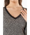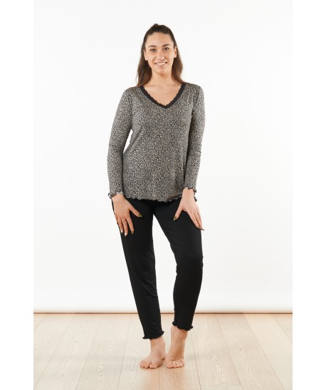 Pigiama in fantasia maculata con maniche lunghe e scollo a V bordato con una lista in pizzo morbidissimo a trama floreale. L'orlo arricciato su polsi e fondo, definito orlo a bambola, dà maggiore elasticità, movimento e rende questo pigiama sia elegante che sbarazzino. Il pantalone lungo è in tinta unita e veste regular.