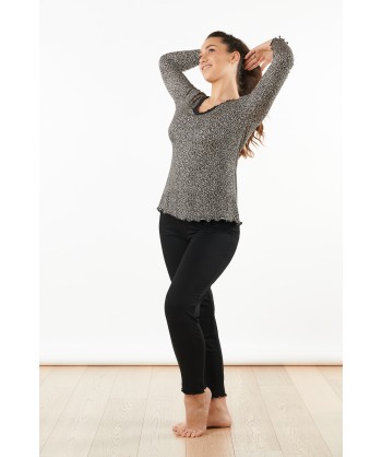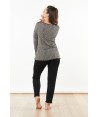 Pigiama con maniche lunghe e scollo a V asimmetrico. Il pantalone è tinta unita e ha una vestibilità regular. La maglia è la particolarità di questo pigiama, la costruzione è basata su tre spicchi due tinta unita e uno maculato che convergono verso il punto vita così da sottolineare la figura. Le maniche riprendono la fantasia maculata e terminano con un polsino basso.