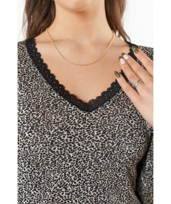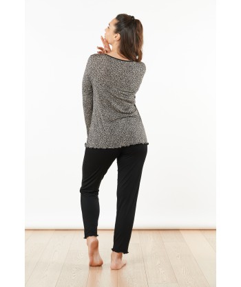 Pigiama con maniche lunghe. Il corpetto in viscosa maculata presenta uno scollo ampio a giro, le maniche in tinta unita terminano con un polsino a contrasto. I pantaloni lunghi dalla vestibilità regular, hanno una banda laterale maculata che riprende il corpetto della maglia.